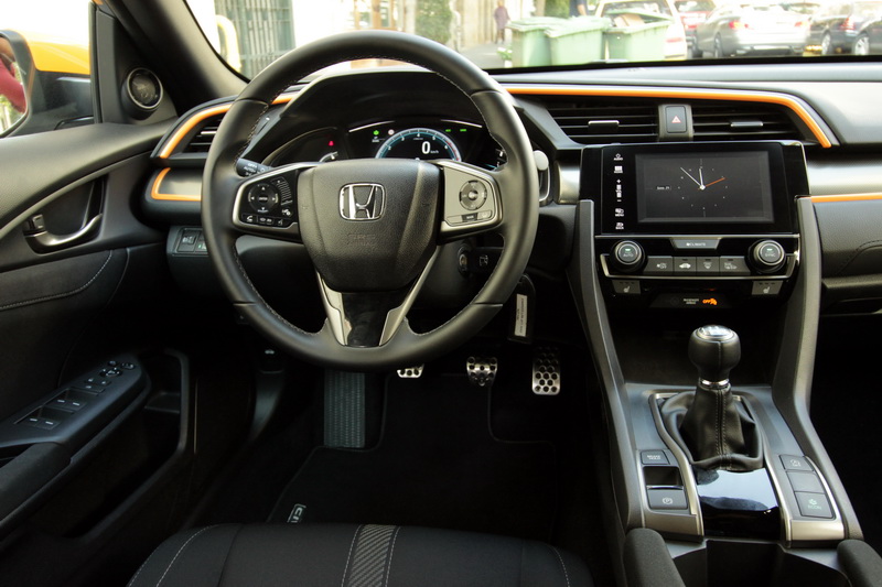 A Honda elengedte az öncélú belső túlbonyolítás eszközét, és az új Civicben minden emberközeli lett. A kormányon lévő kapcsolók száma mondjuk a felsőkategóriában is megállná a helyét, de az érintőképernyővel sok kapcsolót és nyomógombot meg lehetett szüntetni, ami nagyon jól áll az autónak, pláne, hogy a képernyő elhelyezése zseniális lett: a már-már kényszerűen elfogadott, odabiggyesztett tablet helyett, egy remek ízléssel integrált kijelzőt kapunk.