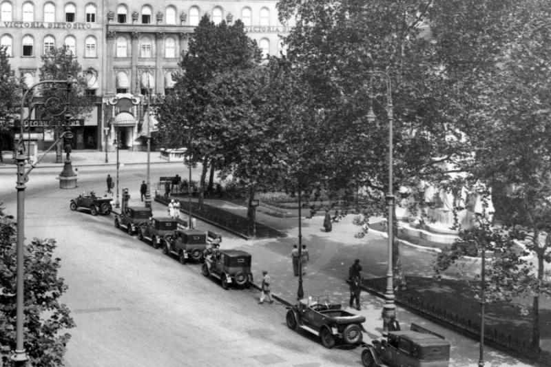Utasokra várakozó Magomobil szürketaxik a belvárosi Vörösmarty téren, a Dorottya utca vonalában