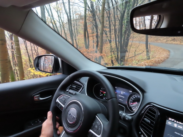 Éppen ez adta egyébként az első döbbenetet. A felázott, sok helyen agyagos-sáros nyomvályús utakon óvatos haladás mellett tulajdonképpen mindig az első tengelyek kapták az összes „erőt”. Határozott, nagyobb gázadás, felfelé kaptatás közbeni kanyarodás kellett ahhoz, hogy 10-20%-nyi nyomatékot hátra küldjön a Compass. Motorfék üzemben viszont azonnal szigorúan bevágja magát 50-50%-os üzemmódba, ami a stabilitás miatt fontos.