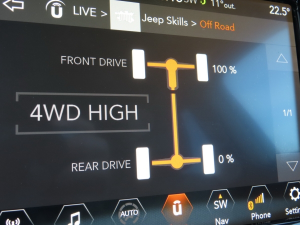 A UConnect érintőképernyős fedélzeti rendszerben a Jeep skills menüpontot kell kiragadni. A fedélzeti alkalmazásban több, interaktív kijelzőt találunk, amelyek a terepjáráshoz kapcsolódó mérőszámokat mutatnak. Kedvencem az összkerékhajátás állapotmonitora, amely „real time” mutatja, hogy a leadott nyomaték hány százaléka jut az első és mennyi a hátsó tengelyre.