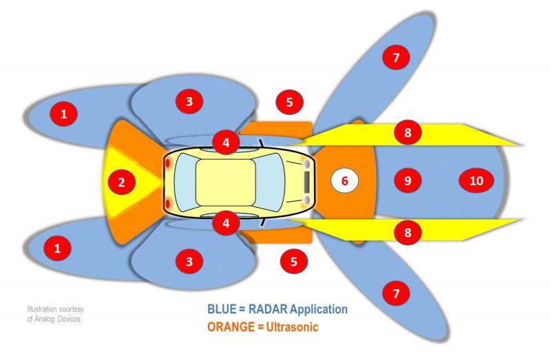 1 – sávváltási asszisztens radarjai, 2 – parkolási segély (kamera és ultrahang), 3 – holt-tér figyelés radarjai, 4 – oldalütközés érzékelés, 5 – automatikus parkolás érzékelői, 6 – parkolási segély, 7 – keresztirányú forgalom érzékelés, 8 – sávelhagyás érzékelés, 9 – automatikus fékezés, kármérséklés, 10 – adaptív követőrendszer (ACC).