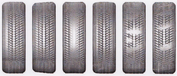 Nagyon fontos dolog a gumiabroncsok nyomásának helyes értéken tartása. Jó kemény gumikkal csökkenthető ugyan a kerekek gördülési ellenállása és ezzel a fogyasztás is, de ugyanakkor pattogósabb, kényelmetlenebb lesz az utazás, de nem utolsó sorban tönkretesszük a guminkat is. A túl keményre fújt abroncs persze nem az autó, hanem a használójának a hibája, mégis megemlítem, mert sokan csak a vásárlás után jönnek rá, hogy az autóhoz járó abroncsok gyakorlatilag csak arra jó, hogy a gumisig elmenjünk vele. A következő képen a maga valójában látható, az alsó ábrán pedig a 3. kép vonatkozik erre a kopástípisra.