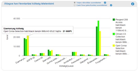 Következő lépésem az, hogy továbbmegyek az értékcsökkenés és az üzemanyag-fogyasztás autónkénti összehasonlítása felé. Ehhez megnézem az átlagos havi fenntartási költséget tételenként ismertető diagramot, ami álló hasábokkal szemlélteti az értékeket. Itt is felugró ablakok mutatják a háttéradatokat a kurzor célirányos mozgatásakor.
