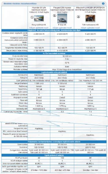 A kurzor hasábokra húzásával előugrik az összehasonlított modell és a havi átlagos fenntartási költsége. Legfelül a leggazdaságosabb Opel Corsa, havi 68.664.-Ft-tal, legalul a Fiat Punto havi 81.902.-Ft-tal. Ezek az értékek azért ilyen kedvezőek, mert készpénzre vásárlással számoltunk, finanszírozás nélkül. Mivel jelenleg ez a jellemző a magánvevők részéről.
