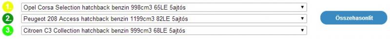 Itt megjegyzem, hogy 7 autóra már elég nehezen áttekinthetőek a TCO Kalkulátor diagramjai, ezért a könnyebb áttekinthetőség érdekében, egyidejűleg 3 modell adatait szemlélhetjük meg a részletesebb elemzésű diagramokban. Hogy melyik 3-at, azt mi határozhatjuk meg és menet közben is változtathatjuk. Én most az összesítő adatok alapján leggazdaságosabb 3-at néztem. Itt lehet változtatni a modelleket: