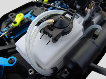 Apropó, kipufogó. A 2 ütemű motorok fontos alkotóeleme a motor kipufogónyílása után felszerelt leömlő és a rezonátor, vagyis maga a kipufogó. Ebből is igen sokfélét kaphatunk, a gyártó általában mindig ajánl egy, a motorhoz hangolt leömlő + kipufogó párost. A modellmotor működéséhez ráadásul nem csak azért kapcsolódik szervesen ez az alkatrész, mert nélküle megsüketülnénk a motor hangjától, hanem azért is, mert természetesen ebben a rendszerben nem találunk üzemanyagszivattyút sem. A kipufogón távozó gázok nyomása egy, a kipufogó tetején lévő szelepen, és üzemanyag csöveken keresztül túlnyomást ad az üzemanyagtanknak, ami természetesen összeköttetésben van a modellmotor karburátorával.