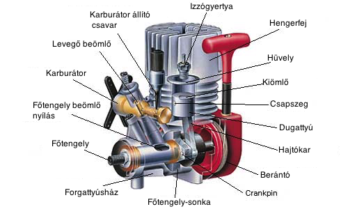 A blokk elülső részének felső pontján csatlakozik hozzá a karburátor, mely a megfelelő levegő és üzemanyag keverék szállításáért felelős. Ennek helyes beállításról több cikkünk is született, érdemes ezeket áttanulmányozni. A blokkban alul forog két nagyon jóminőségű golyóscsapágyban a főtengely. A Főtengely végén lévő sonka csapszegéhez kapcsolódik a hajtókar, melynek végén a dugattyú üldögél és mozog iszonyatos sebességgel le és fel a hüvelyében. A blokk hátsó felső részéhez csatlakozik a hengerfej, melyben középen helyezkedik el a cserélhető izzógyertya. A blokk hátsó részén a kialakítástól függően egy hátlap és fenti képen egy berántós mechanizmus áll. A főtengely másik végén, ami előre lóg ki a blokkból, nos oda csatlakozik a lendkerék, kuplungszerkezet és valamilyen fogszámú kuplungharang, mellyel a motor meghajtását át tudjuk adni a modell hajtásláncára.