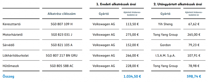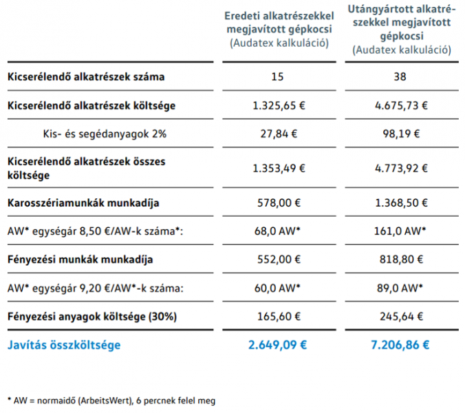 Nemcsak az alkatrészek minőségében, hanem annak áraiban is elvégezték az összehasonlítást, ahol az első javítás közel 500 Eurós plusz költséget jelentett a gyári szabványszerinti javítás utolsó rubrikájában. Az újbóli javításnál megfordult a mérleg nyelve és mintegy 4500 Euróval került többe annak a gépkocsinak az újbóli talpra állítása, amit korábban nem gyári alkatrészekkel javítottak.