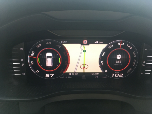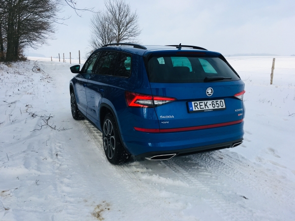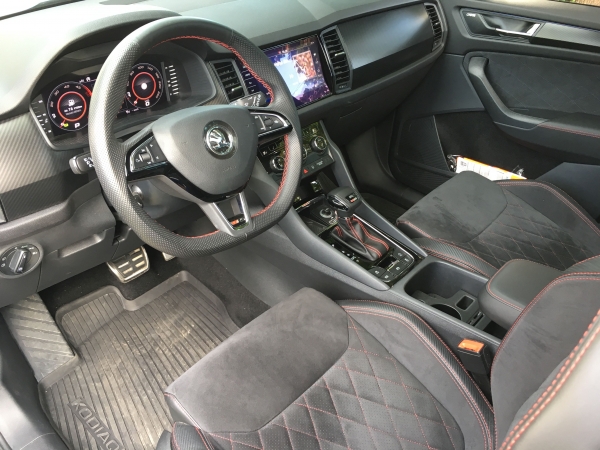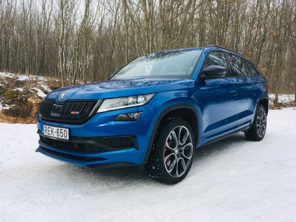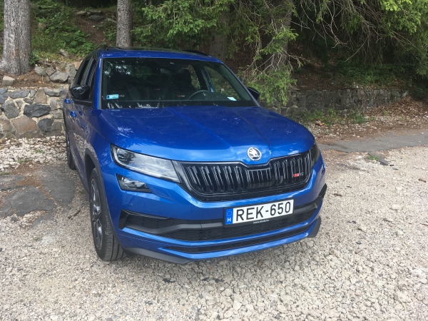 Az RS a Kodiaqok közül kitűnik látványos versenykék fényezésével, 20 hüvelykes antracitszürke Xtreme felnijeivel, sajátos lökhárítóival, piros féknyergeivel és persze V8-asokat megszégyenítő hörgő-röfögő-dübörgő hangjával. Ha nem SUV lenne, azt mondhatnánk rá, hogy a Skoda első igazi élményautója. A hangélmény hatásos, de sajnos hamis, mind bent, mind pedig kint hanggenerátorból, azaz hangszóróból halljuk a bugyborékolást.
