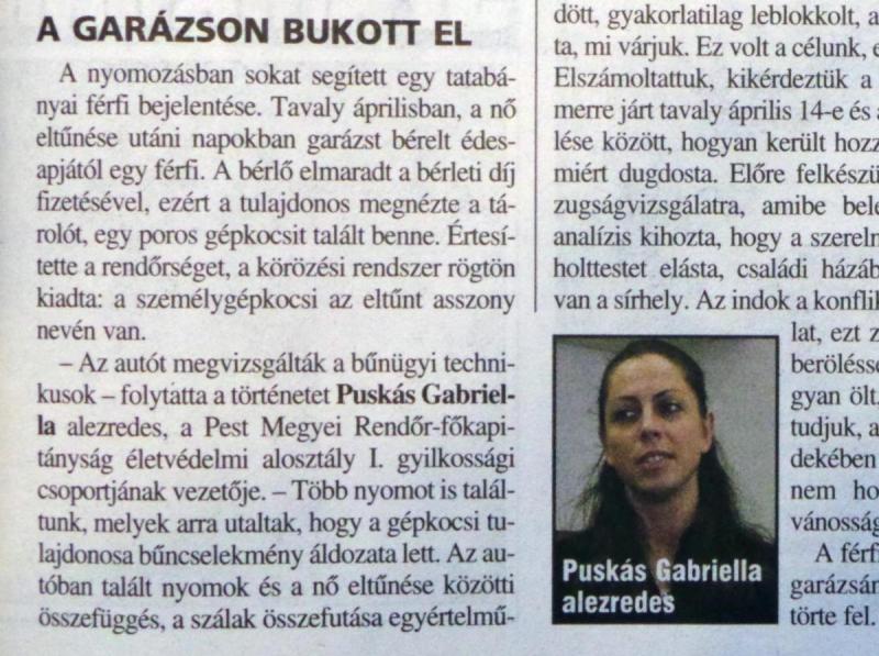 Ugyanakkor egy apró, ámde a mi szempontunkból nézve fontos momentum kimaradt a cikkből, ezt szeretném az olvasóinkkal megosztani. Mint a Zsaru magazinban olvasható, „a nyomozásban sokat segített egy tatabányai férfi bejelentése”. A gyilkos ugyanis tavaly áprilisban ettől a férfitól bérelt egy garázst, melyben elrejtette az elhunyt nő által használt Hyundai Tucson 2.0 CRDI típusú terepjárót. Az autó és a hölgy eltűnéséről bejelentést tett az AUTOVADASZ.EU weboldalon is az egyik hozzátartozó, így az autó adatai megjelentek a facebook oldalainkon, a mobiltelefonos alkalmazásunkban és a netes adatbázisunkban is. A gépjármű adatainak a felsorolása után a következő megjegyzés szerepelt: