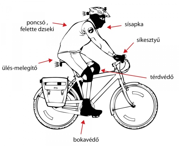 Miután átnéztük a bringát, nem árt az önvizsgálat sem. Mit vettünk fel? Vegyünk fel valami gyorsan száradó anyagból készült sportos szerelést! A pamut nem jó: lassan szárad, garantált megfázás estefelé. Ha semmiképp sem vagyunk hajlandóak lemondani stílusos összeállításunkról, legalább a nadrágszárunkat/szoknyánkat tűzzük fel, nehogy bekapja a lánc vagy a küllők. A csúnya olajfoltokat is elkerüljük így, hacsak nem egy Stringbike van alattunk, mert akkor eleve fel sem merül a probléma.