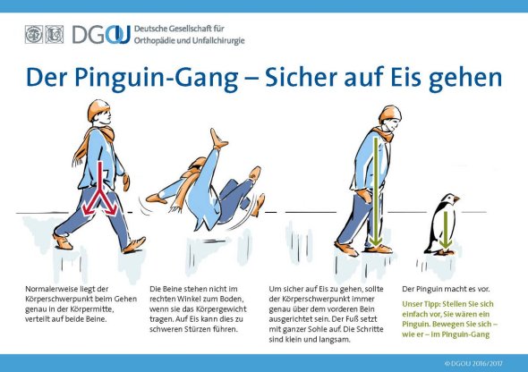 Ahhoz, hogy biztonságosan járhassunk a jégen, sétáljunk kissé terpesztve, és kicsit előredőlve. A teljes súlyunkkal nehezedjünk az elöl lévő lábra. A talp teljes felülete érintkezzen a talajjal, és lassú, kis lépésekkel haladjunk. A kezünket ne tegyük zsebre, inkább használjuk egyensúlyozásra.