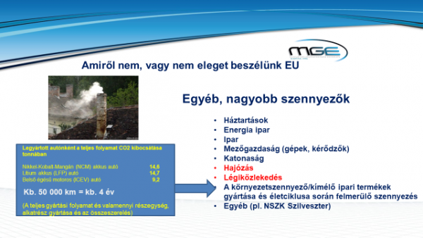 A járműiparnál vannak sokkal szennyezőbb területek is. Ilyen a légi forgalom és a tengeri hajózás. Példákat is mondott. Egy óceánjáró, amely 6780 utast szállít, 2100 fős személyzet szolgálja az utasokat, naponta 363 ezer liter gázolajat használ el. Nyolc literes átlagfogyasztással számolva ezt a mennyiséget 300 autó használja fel egy év alatt, ha 4,5 millió kilométert tesznek meg.