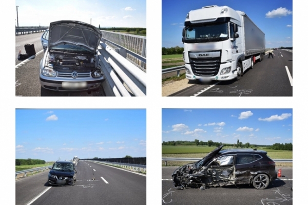 Az idős sofőr Győr irányába közlekedve érintőlegesen nekiütközött egy szabályosan, a belső forgalmi sávban érkező autónak, amitől az, a külső sávban haladó járműszerelvénynek csapódott. Mindkét személygépkocsi a szalagkorlátnak ütközve állt meg. A baleset során három ember megsérült, őket a mentők kórházba vitték.