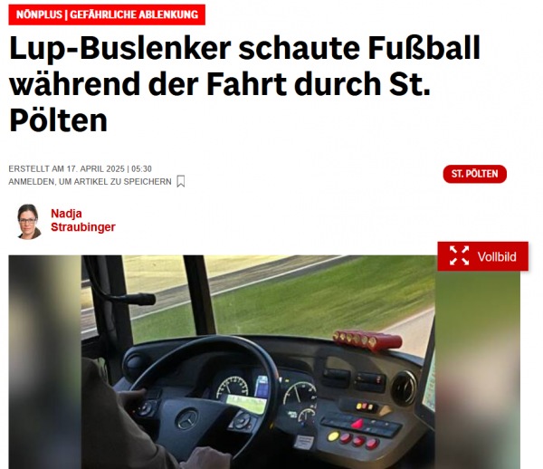 "Ha a sofőr a munkájára koncentrált volna, a Hauptbahnhof Nord megállóhelyen egy utas nem esett volna el beszállás közben" - mesélte az utas a "NÖN" lapnak a St. Pölten-i Lup vonalon közlekedő buszsofőr viselkedéséről, aki futballmeccset nézett mobiltelefonján.