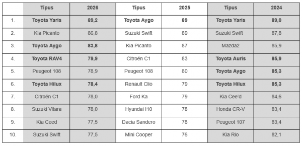 Az eredmények nem hoztak meglepetést: a dobogón két Toyota is helyet kapott. A legmegbízhatóbb típus a Toyota Yaris, amely a maximálisan elérhető 100 pontból 89,2 pontot kapott. A jelentett meghibásodás átlagosan az autók 7,9 éves koránál jelentkezett. Ezzel a Yaris visszatért a csúcsra: 2024-ben szintén a Toyota kisautója bizonyult a legjobbnak, akkor 89,0 ponttal. A tavalyi győztes Toyota Aygo (89 pont) idén 83,8 ponttal a harmadik helyen végzett. A városi mini átlagosan 7,7 éves korában hibásodik meg.