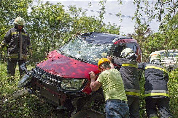 Árokba borult személyautó műszaki mentésén dolgoznak tűzoltók Ráckeve külterületén 2018. április 30-án, miután a jármű eddig tisztázatlan körülmények között lesodródott az útról, majd felborulva az út menti árokba csapódott. Az autó vezetője a helyszínen meghalt, utasa megsérült. MTI Fotó: Lakatos Péter