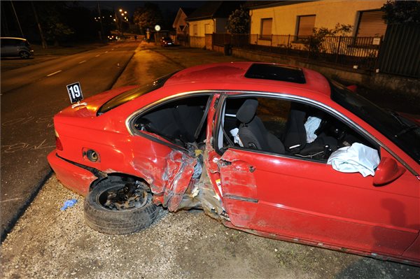 Összeroncsolódott személyautó a veresegyházi Fő úton 2018. április 30-án hajnalban. A police.hu közlése szerint a jármű eddig tisztázatlan körülmények között az árokba hajtott, majd egy villanyoszlopnak ütközött. Az autóban utazók közül egy ember meghalt, további két személy könnyű sérüléseket szenvedett. MTI Fotó: Mihádák Zoltán