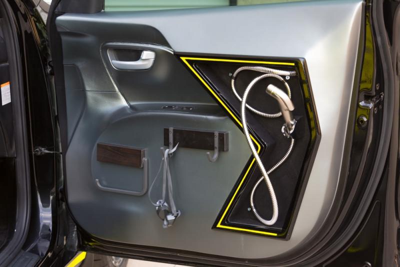A hiányzó B oszlopok kívül egyéb érdekesség még az első ajtóba beépített hordozható zuhany is.
