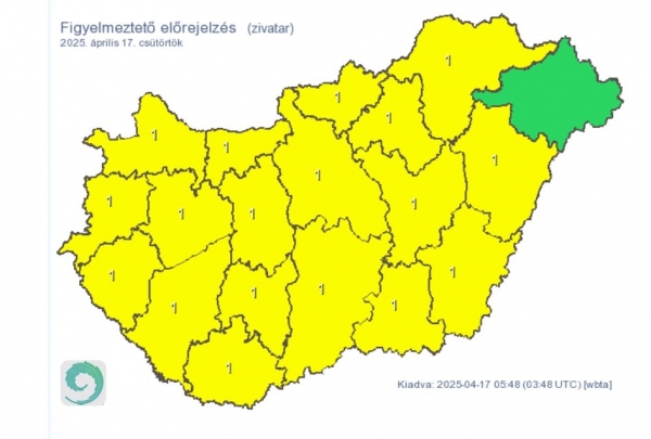 Országszerte zivatarok alakulhatnak ki, elsődleges veszélyforrást a villámlás jelent, emellett esetenként szélerősödés, jégeső előfordulhat! Ma délutántól délnyugat felől előbb a Dunántúlon, annak is nagyobb valószínűséggel a középső részein, keleti felében szórványosan zivatarok kialakulása valószínű.