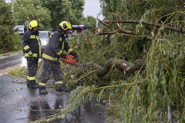 A viharban kidőlt fát távolítanak el az útról tűzoltók Nagykanizsán 2023. június 23-án. MTI/Varga György