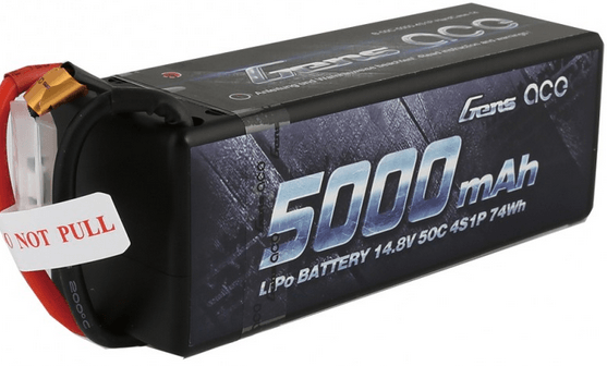 Ezen a képen egy 5000 mAh-s kapacitású, 4 cellás (4S, vagyis 4x 3.7V), 14.8V-os feszültséget adó, 50C folyamatos terhelhetőségű LiPo akkupakkot látunk.