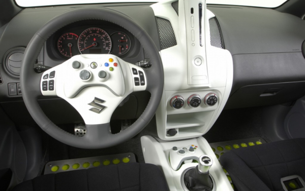 Kívül a kor tipikus szögletes lökhárítóit, sötétített fényszóróit, és zöld felniket kapott az SX-4, a lényeget azonban belül kellett keresni. Nos, igen, itt nem a zölddel vegyített fém taposó a legmeglepőbb. Hanem a középkonzolba korántsem diszkréten integrált Xbox játékkonzol, valamint a kormányba integrált kontroller, ami alatt egy ferde Suzuki jelvény is feltűnik. Egy további kontrollert kapott a pohártartó eddigi rekesze, hogy teljesen legyen az indokolatlan játékélmény. Mindehhez kagylóülések dukáltak. Jogosan merülhet fel a kérdés: hol van a képernyő? Nos, abból jutott a csomagtartóba, az első ülések hátlapjára, de a legmeglepőbb mégis az első sor számára szánt megoldás. Egy projektor, ami a felnyitott motorháztető belső oldalára vetít. Nos, ilyen is volt…