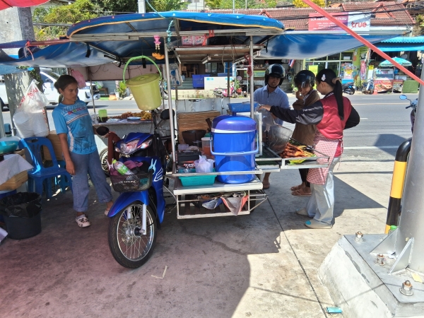 Oldalkocsis motorkerékpárról mindent is árulnak Thaiföldön, de amit az európai szem azonnal észrevesz, az a mozgó helyi gyorsétkezde. Ahogy a művelt magyar mondja: street food. Kilencven százalékban sült csirke, a maradékban hal és egyéb frissen készült élelmiszer a kínálat. A gázpalack minden ilyen guruló büfének elengedhetetlen kelléke, az akkumulátorról működtetett hűtőpult, -szekrény már nem annyira. Tört jéggel hűtik a nyers árut, de ha megszakad valahol a hűtési lánc az nagyon meg tudja viselni a bátrabb – és olcsóbb kajára vágyó – európai ember gyomrát…