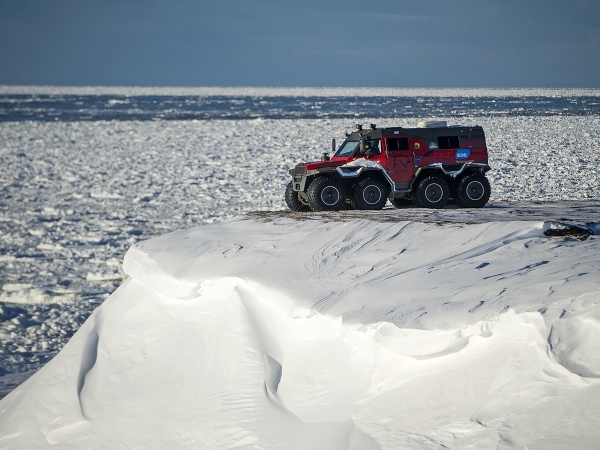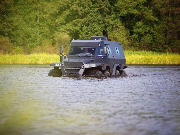 Egyetlen gondja, vagy előnye, hogy kétségtelenül feltűnő, mindenki felfigyel rá úton, vízen. A nyolckerekű Sámán nevű ATV (All terrain Vehicle) zárt váza védi a sebességváltót, terepjáró képességei pedig a különleges független felfüggesztésének köszönhető. Az alacsony nyomású gumiabroncsú jármű könnyedén halad mocsarakban, tundrán, folyókon, sekély tavakon.