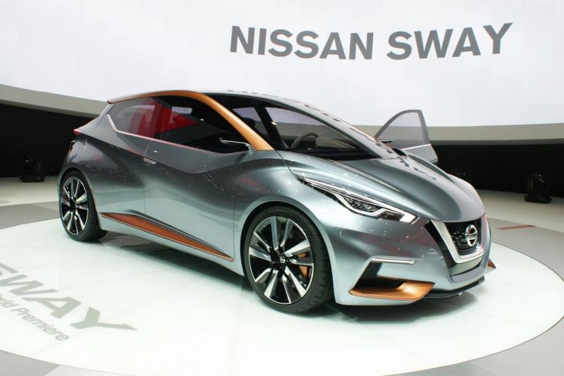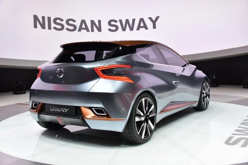 A Sway-t a piac hagyományosan legkonzervatívabb kategóriájának, a kisautók szegmensének felrázására tervezték. Formaterve a meredek vonalaknak, a lenyűgöző orrnak, az elegánsan egyszerű belsőnek és a kifinomult színek merész használatának köszönhetően szokatlan és stílusos. A Sway külseje négy kifejezetten eltérő elemet ötvöz: a V alakú hűtőrácsot, a lebegő hatású tetőt, a bumeráng alakú fényszórókat és a megemelt C-oszlopot. A Sway az első kisautó, amelyben az új formanyelvet alkalmazzák, az egyéb piaci szegmensek későbbi Nissan modelljei pedig minden régióban követni fogják ezt a stílusbeli irányvonalat.