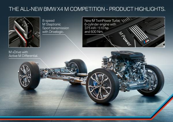 A vadonatúj fejlesztésű erőforrás a Drivelogic-kal dolgozó, nyolcfokozatú BMW M Steptronic automataváltón keresztül továbbítja teljesítményét és forgatónyomatékát az új BMW M5 sportlimuzinban debütált BMW M xDrive intelligens összkerékhajtás felé. Utóbbi technológiát a tervezők a hátsókerék-meghajtás preferenciái szerint hangolták a sportos négyes alá, kétféle összkerékhajtási üzemmódot kínálva fel a bajor prémiumgyártó ügyfeleinek. A BMW M xDrive intelligens összkerékhajtás és a hátsó tengelybe épített, aktív M differenciálmű központi vezérlése minden vezetési szituációban az optimális tapadás, a lehető legsportosabb agilitás és a legtökéletesebb iránystabilitás követelményei szerint osztja el a négy kerék között a motorból érkező erőt. A BMW X3 M és a BMW X4 M egyaránt 4,2 másodperc alatt gyorsul fel álló helyzetből 100 km/órás sebességre, amelyhez a modellpáros Competition kiviteleinek mindössze 4,1 másodpercre van szüksége.