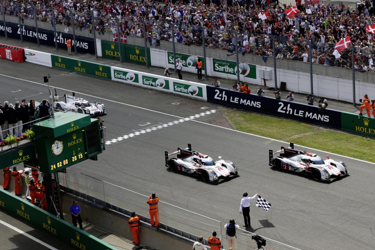 A német Andre Lotterer, a svájci Marcel Fässler és a francia Benoit Treluyer alkotta csapat felváltva vezette az Audi R18 e- tron quattrót, s pontban három órakor elsőként haladt át a célvonalon.