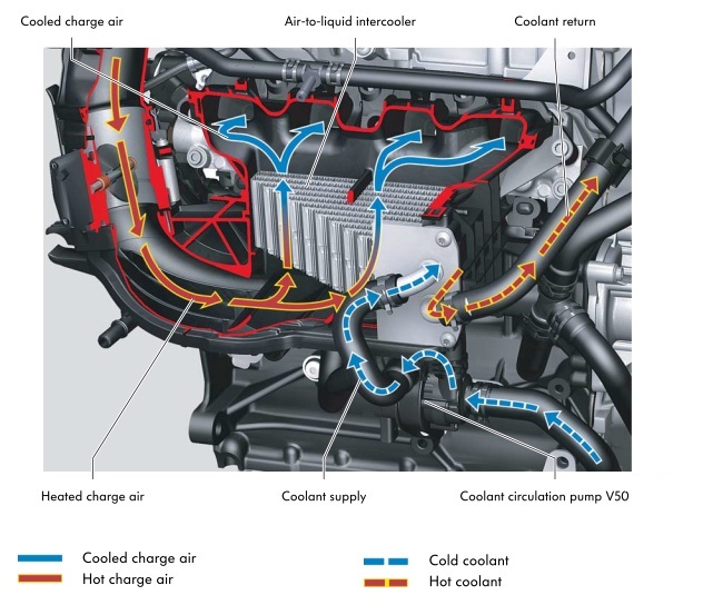 Ha a töltő komprimálta a levegőt, azt egyben, a fizikai folyamatnak megfelelően, fel is melegíti. Jót tesz a motornak, a kihozható motormunkának, az emissziónak, ha a levegőt mielőtt a hengerbe jut, visszahűtjük. Ez a hűtő a töltőlevegő visszahűtő, közbenső hűtő vagy intercooler. Eddig általában egy levegő/levegő hűtőt építettek be, és azt a motor vízhűtője és a légkondicionáló hűtője társaságában helyezték el az autó orrában. Két levegő/levegő hűtő két esetben lehet: