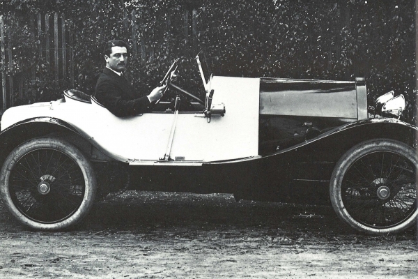A francia repülő pilóta, Roland Garros a „Black Bess” néven ismert Type 18 Bugatti volánjánál ül (Forrás: Louwman Múzeum)