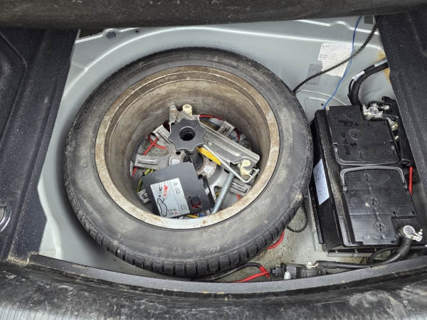 Elöl 5, hátul 11 éves abroncsok vannak a könnyűfém keréktárcsákon. Az öreg hátsó gumik ráadásul nem megfelelő méretűek voltak, de a gumis valahogyan rámelegítette a felnikre azokat.