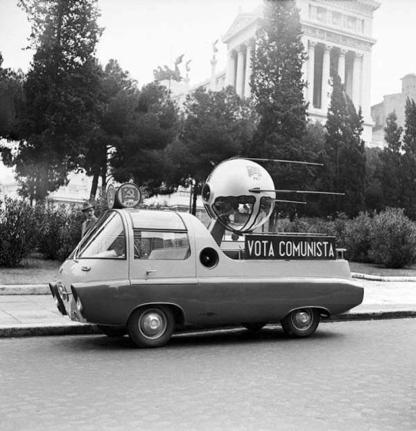 Ezt a Fiat 600 Multiplát a a PCI, az Olasz Kommunista Párt használta az 1958-as választások során. A Boneschi olasz karosszériaműáhely megbízást kapott, hogy építsen egy másolatot a Szputnyik műholdról, amelyet arra használtak, hogy bemutassák a Szovjetunió prosperitását és technológiai fejlettségét, mint okot arra, hogy Olaszországban is a kommunista pártra szavazzanak. Forrás: Alessandro Sannia