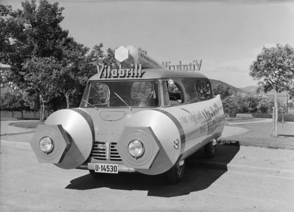 Ha minden igaz a gyermekvédelmet népszerűsítő pódiumautó 1947-ben. Forrás: Fortepan/Berkó Pál