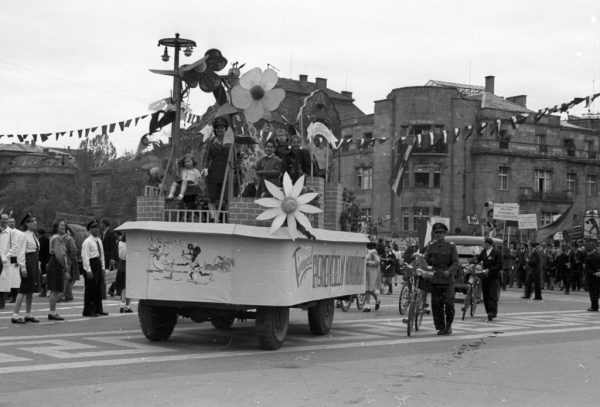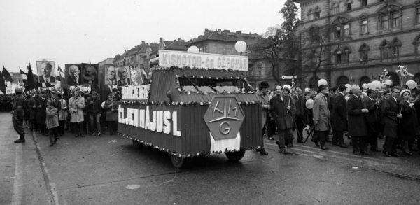 A Kismotor- és Gépgyár az 1974-es május 1-i felvonuláson. Forrrás: Fortepan/szitakri