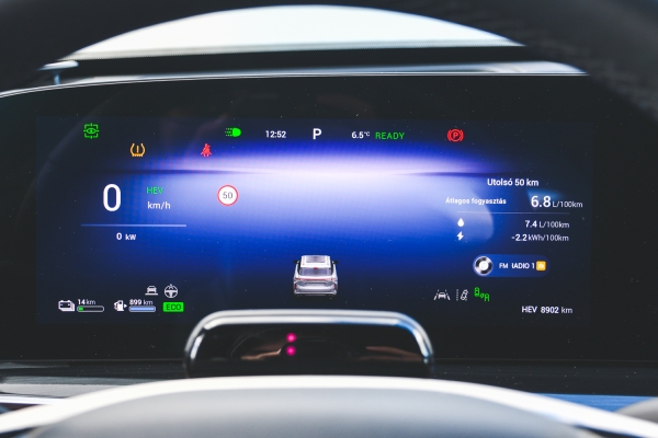 Míg előre egy 102 és egy 122 lovas villanymotor jut, addig hátra egy 238 lóerős. Így jön ki az összkerékhajtás, és mindent összeadva egy állítólagos 537 lóerős rendszerteljesítmény. Ebből sokat lenyel a tömeg, de tényleg elképesztő mekkorát gyorsul ez a hatalmas test, ami egyébként egy 660 literes, remekül pakolható, végig flokkolt csomagtartót és egy padlóba helyezett, meglepően nagy, DC-ről akár 65 kW-tal tölthető 34,46 kWh-s lítium-ion akksit is takar. Utóbbival 145 km-es hatótávot ígérnek gyárilag, amit a nagy hideg ellenére is majdnem hozni tudott, míg benzinmotorról hajtva 6,7 literes átlagot tudott a komputer szerint, ami ehhez a mérethez kifejezetten kedvező érték.