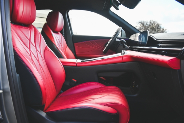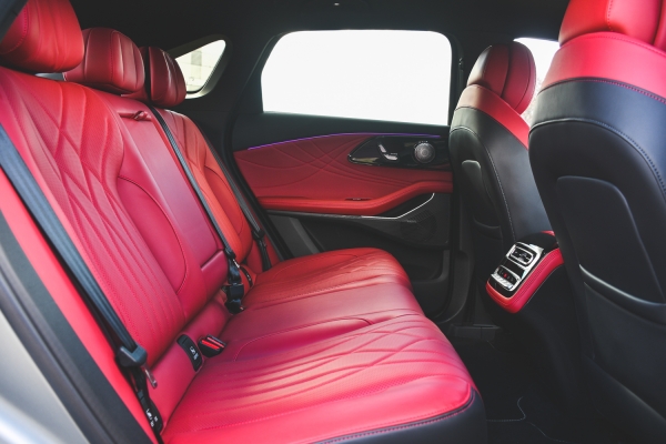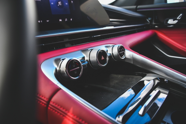 Ennek megfelelően a körítés is nagyvonalú. Ha eltekintünk az indokolatlan négy kipufogóvégtől és a szögletes féklámpáktól a szárnyon, akkor ez egy nagyon atlétikus, már-már kupésított, de mégis tekintélyt parancsoló forma, igazi klasszikus luxusautós arányokkal: elnyújtott, hosszú orral, és finoman lefelé ívelt tetővonallal. Egészen különleges, mégis szépen kivitelezett megoldásokkal, mint például a C-oszlopba hegyesen beleívelt oldalablakok. Ebben a matt fényezésben, 20-colos, sűrű küllős felnikkel, vörös belsővel párosítva különösen fennkölt konfiguráció ez, ám némileg utal arra a stílus katyvaszra, ami az utastérben vár ránk.