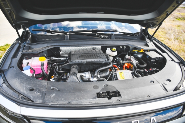 Az Omoda 9-ben is ugyanaz a négyhengeres, 105 lóerős, 1,5-literes T-GDI benzinmotor dolgozik, mint a Jaecoo 7-ben, csak itt nem egy, hanem rögtön három villanymotorral párosítva. És ami szintén nagyon lényeges különbség, hogy nem 7-fokozatú duplakuplungossal párosítva, hanem csak egy 3-fokozatú DHT-val (Dedicated Hybrid Transmission). Szóval itt is erősen alárendelik a hajtást a villanynak, és csak erős gázadásra dolgozik párhuzamos hibridként, az esetek túlnyomó többségében a soros hibrid működést preferálja, tehát a benzinmotor egyfajta generátorként működik inkább. Akkor is hangtalanul, a háttérben meghúzódva, bár hidegen egy kicsit zörgős a hangzása.