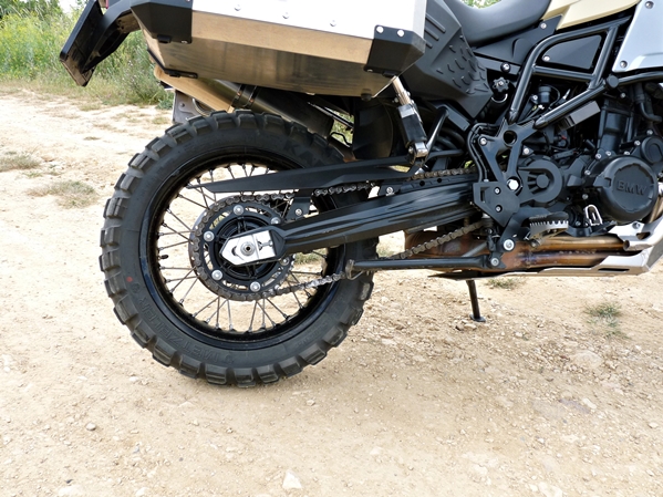 A váltó rövid utakon jár, de férfias beavatkozást igényelnek a fokozatváltások, röviden tehát elmondható, hogy a kinézetéhez híven kell vele bánni, különösen ha letérünk az aszfaltról. Ott azonban elemében van az F800 GS Adventure. A nagytestvér méreteihez közel azonos dimenziók és az említett 30 kg-mal karcsúbb test előnyei itt jönnek elő igazán. A futómű, ami a terepmotorozás achilles-pontja, nem változott az alapmodellhez képest. Az egykettes boxernél alkalmazott Telelever-Paralever rendszer helyett itt egy sokkal egyszerűbb, elöl 230 mm-es, hátul 215 mm-es rugóúttal rendelkező hagyományos teleszkópos-központi rugóstagos rendszert alkalmaztak, elektromos futómű-állítási (ESA) opcióval megspékelve. A keskenyebb gumik pedig kimondottan jól jönnek a dagonyázáskor, szóval néhány kör után máris revideáltam a kezdeti megalomániából fakadó elhatárólódásomat.