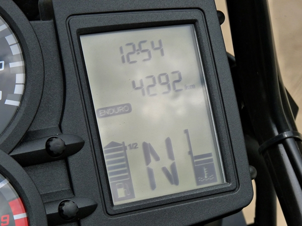 Ez utóbbi részlete a motornak, vagyis az abroncsok mintázata, mellyel a motor elsődleges felhasználási területét is determináljuk a vásárláskor, meghatározható. Tehát a bütykök nélküli közúti kivitelt is bírják a küllős felnik, ráadásul jól is állna az egyébként varacskos disznó kinézetű endurónak a KTM Supermoto-kon gyakran használt abroncs. Tesztalanyunk a képen látható Metzeler Karoo2-vel volt felszerelve, ebből kifolyólag látható, hogy hova szánták. Mondanom sem kell, hogy nem kanyarvadászatra. A döntögetéshez szükséges kooperációhoz lehet, hogy több időre lett volna szükség, de számomra nem volt meggyőző a teszthét során szerzett tapasztalat. A városi motorozás megint csak feladja a leckét a nem túl tapasztalt ridereknek, ugyanis a két dobozzal mért teljes szélesség 105 cm-es, ez esetben megfontolandó a kocsisorok közötti lavírozgatás.