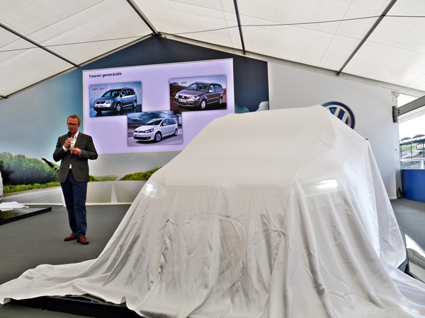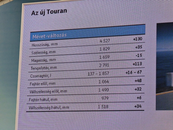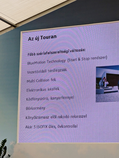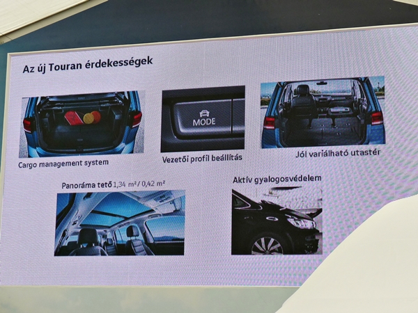 A márkatalálkozó másik főszereplője az új Touran volt, amelyről elöljáróban annyit tudtunk meg, hogy a magasságát kivéve, minden külső paramétere bővült, és ennek köszönhetően a sziluettje inkább sportos, mint buszos lett. Néhány dolgot itt is kiemelt a márkaigazgató, mint például az 5 darab ISOFIX ülésrögzítési lehetőséget, a csomagtér praktikus megoldásait (lámpa, sínek, pántok, stb.), a multifunkciós kijelző és egyéb asszisztensek személyre szabhatóságát, az ún. apa/anya funkciót, valamint a bőrkormányt és az 1,3 négyzetméteres napfénytetőt.