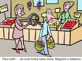 Heti rajzunk készítője Kelemen István, karikatúrájának címe: Piaci sofőr.