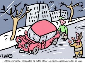 Heti rajzunk készítője Kelemen István, karikatúrájának címe:Látom szomszéd, hóesésben autóztál.