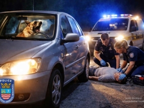 Egy gépjárműbe zárt mentőkutya által leadott fényjelzéseket észlelve, biztonsági intézkedés keretében mentették meg a rendőrök az állat 46 éves gazdájának életét.