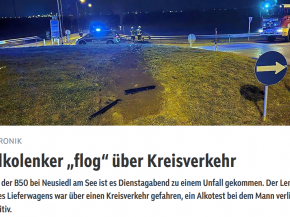 Baleset történt a B50-es úton Ausztriában,Neusiedl am See közelében, közel a magyar határhoz kedd este. Egy szállító jármű sofőrje áthajtott egy körforgalmon, a férfi alkoholszondája pozitív lett – írja az orf.at.