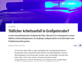 Halálos munkahelyi baleset történt múlt hétfő este egy autóipari beszállítónál az osztrák Großpetersdorfban (Oberwart kerület). Egy 38 éves großpetersdorfi férfinak beakadt a feje egy gyártógépbe – írja az orf.at.