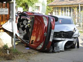 Összeroncsolódott személyautók a XV. kerületi Esthajnal és Bogáncs utca kereszteződésénél 2016. november 1-jén. A két autó összeütközött, az egyik jármű felborult és egy kerítésnek szorult, súlyosan sérült vezetőjét a tűzoltók szabadították ki a roncsból. MTI Fotó: Mihádák Zoltán